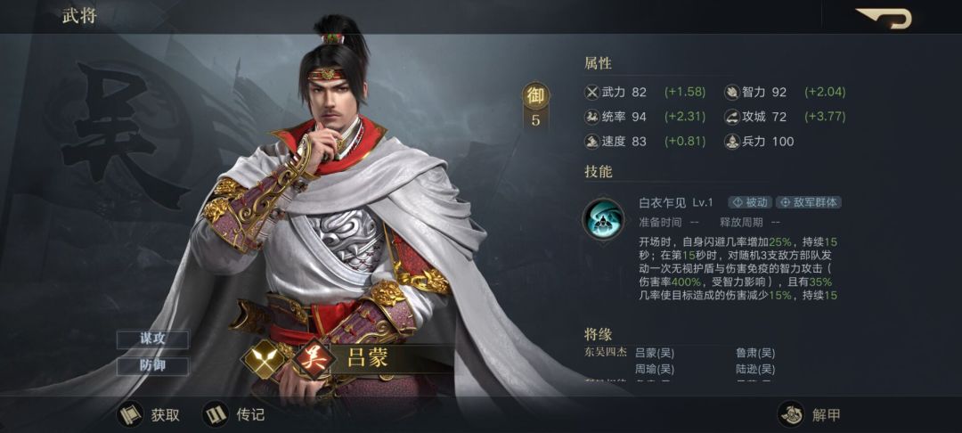 第二个登场的是士别三日,当应刮目相看的吕蒙。作为队伍中的前排,吕蒙技能白衣乍见除了能提高了自身闪避率外,还能对随机3支敌方部队发动一次无视护盾与伤害免疫的智力攻击伤害,并有一定几率使目标造成的伤害减少。