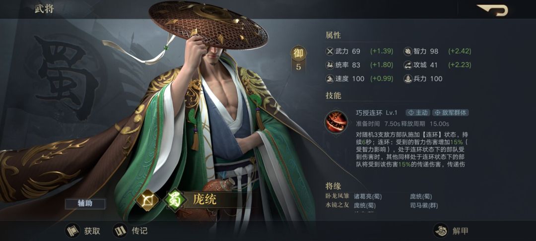 最后一位登场的蜀国武将正是庞统,庞士元。其技能巧授连环可以对3支敌方部队施加连环状态,而处于连环状态下的敌军部队受到伤害时,其他同样处于连环状态下的部队将受到该伤害15%的传递伤害。