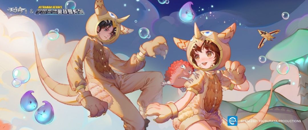 同时,我们也提取了奥特曼系列IP中的某些元素,设计出了独属于天谕的内容。比如这套“怪兽服”,就是参考了怪兽哥莫拉的造型,蓝色眼睛与天谕主美术风格中的清新不谋而合。加上毛绒质感的设计,让整套衣服更显可爱。