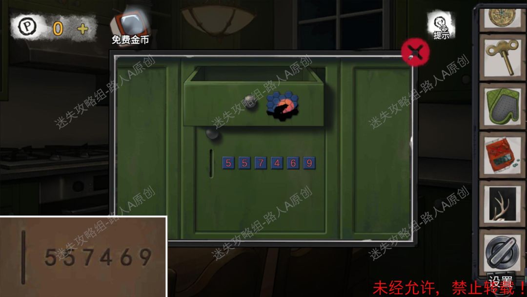 21.返回厨房,在橱柜输入密码【557469】,获得【镶嵌物】。21.1