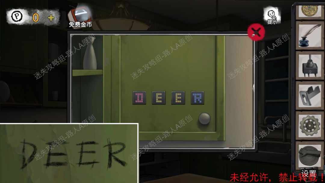 35.返回厨房,在橱柜输入密码【DEER】,获得【鹿角】。35.1