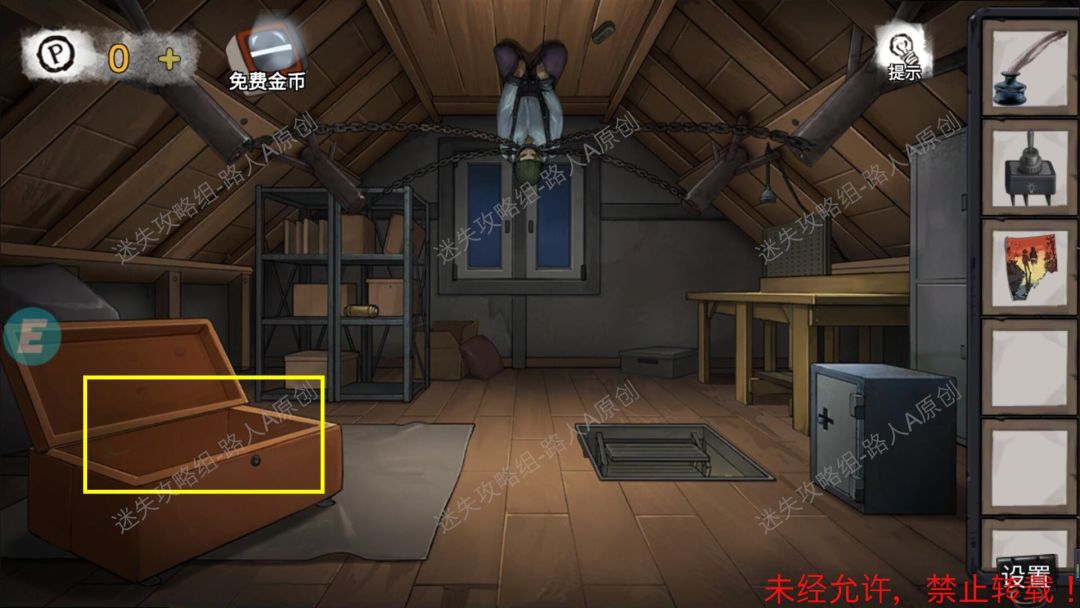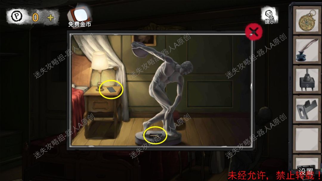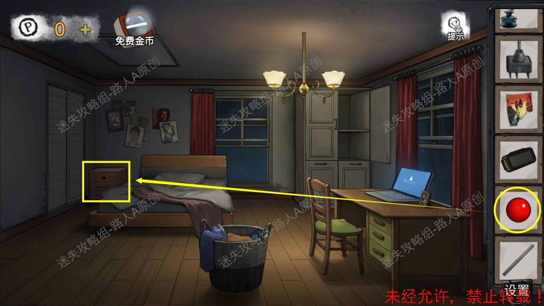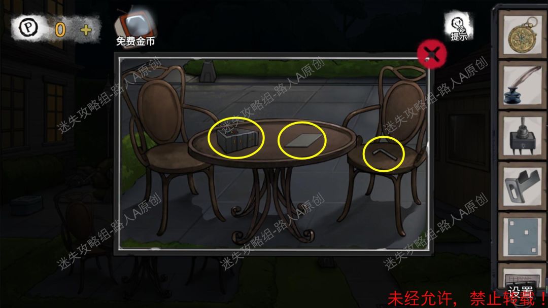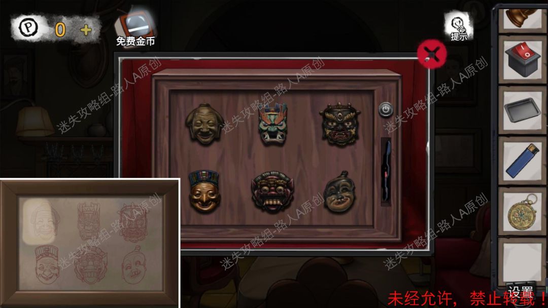 7.拾取地上的【镜子】,然后用【钥匙】打开桌下的盒子,获得【棋子】和【开关】。7.1