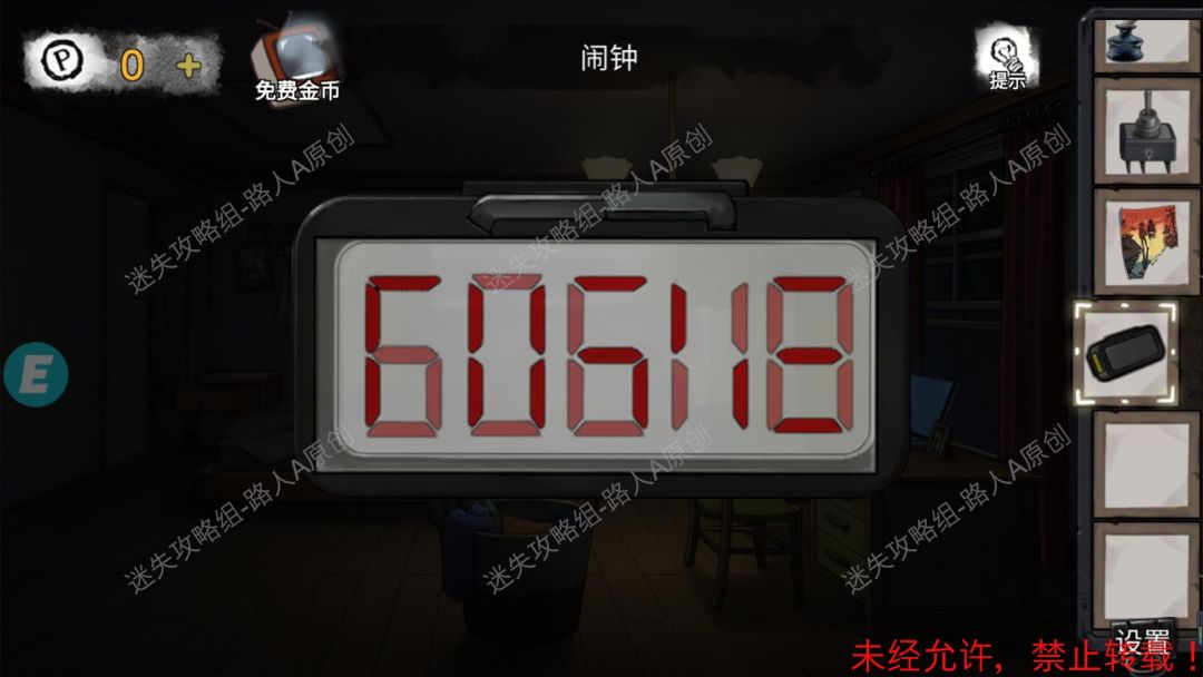 62.查看物品栏里的【闹钟】,安装【电池】和【弯头长柄机关】,再使用【提示板】,得到密码【606118】。62.1