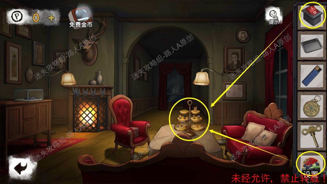 17.返回客厅,把【甜点】和【开关】放入点心塔,完成谜题,获得【门禁卡】。(这个是随机谜题,一共12个甜点,其中会有6组相同重量的甜点。这里可以利用第一层的天平,找出相同重量的甜点,再把它们分配到第二层和第三层的天平。)17.1、17.2