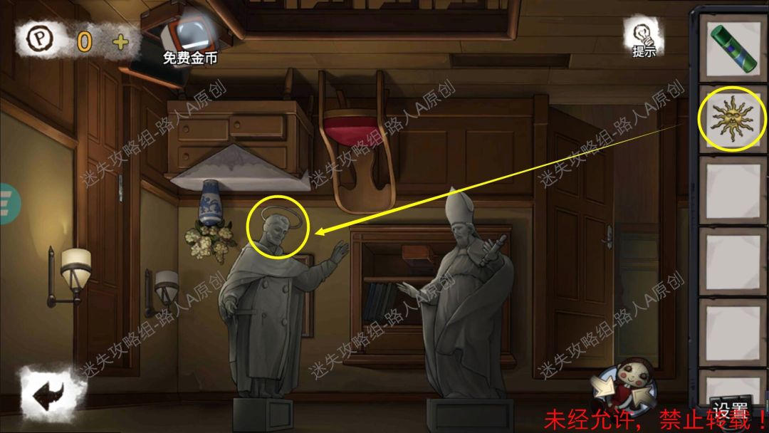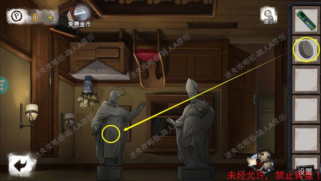 78.返回二楼,颠倒场景至天花板,把【石头眼睛】放入雕像凹槽,获得【纽扣】。78.1