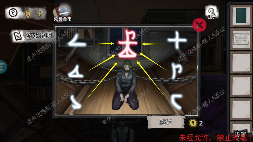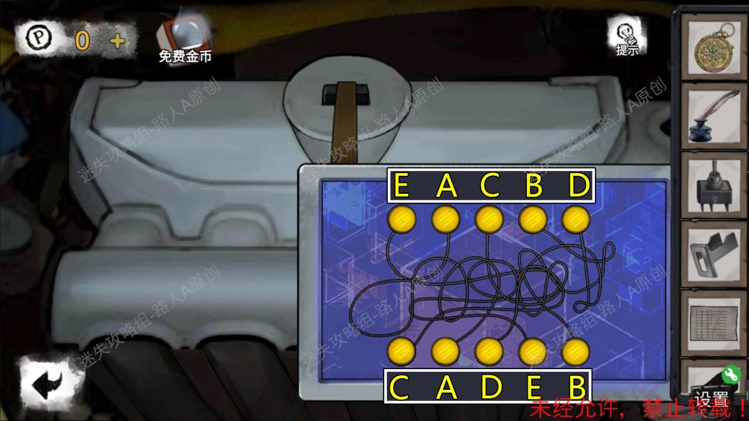75.颠倒场景至天花板,查看左边的柱子,完成一笔画谜题,获得【圆形纽钉】。75.1