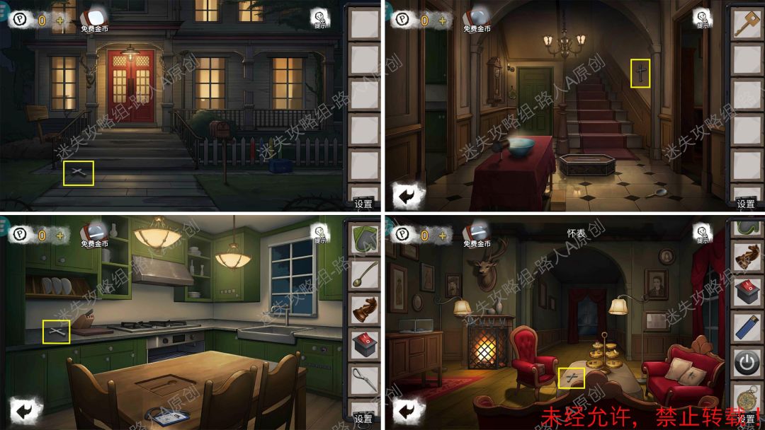 13.前往客厅,用【剪刀】剪开沙发上的抱枕,拾取【怀表】、【打火机】和【按钮】。13.1