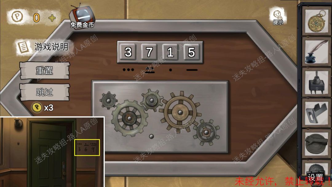 37.返回门廊,把【齿轮】放入地上的大箱子,调整齿轮位置。然后再根据线索,输入密码【3715】,获得【铁棍】。37.1