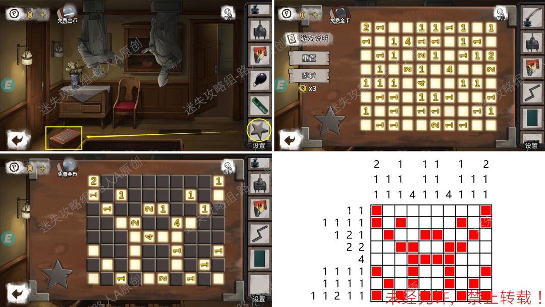 69.返回二楼,把【五角星】放入盒子凹槽,完成谜题,获得【海报】。(这是数图谜题,横向数字归行,纵向数字归列,把谜题里的数字整理一下会比较容易明白。数图规则:在上方和左边有数字标示,数字表示该行或者列的连续点亮格子数量,多个数字表示连续的点亮格子之间至少有一个格子是空格。)69.1