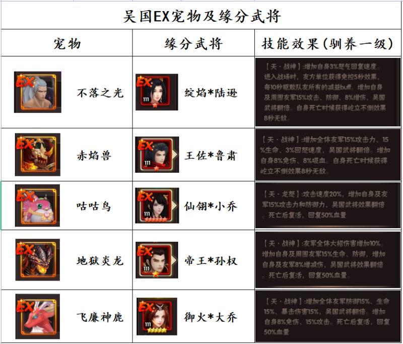因为不好打字用表格显示,将资料用表格截图出来分享,四个国家的ex宠物及对应缘分武将合集来咯!虽然国家之间都有各自宠物,但仁者见仁智者见智,每个人对于游戏理解不一样,会尝试更多的宠物和阵容搭配,以下宠物仅作为资料参考!