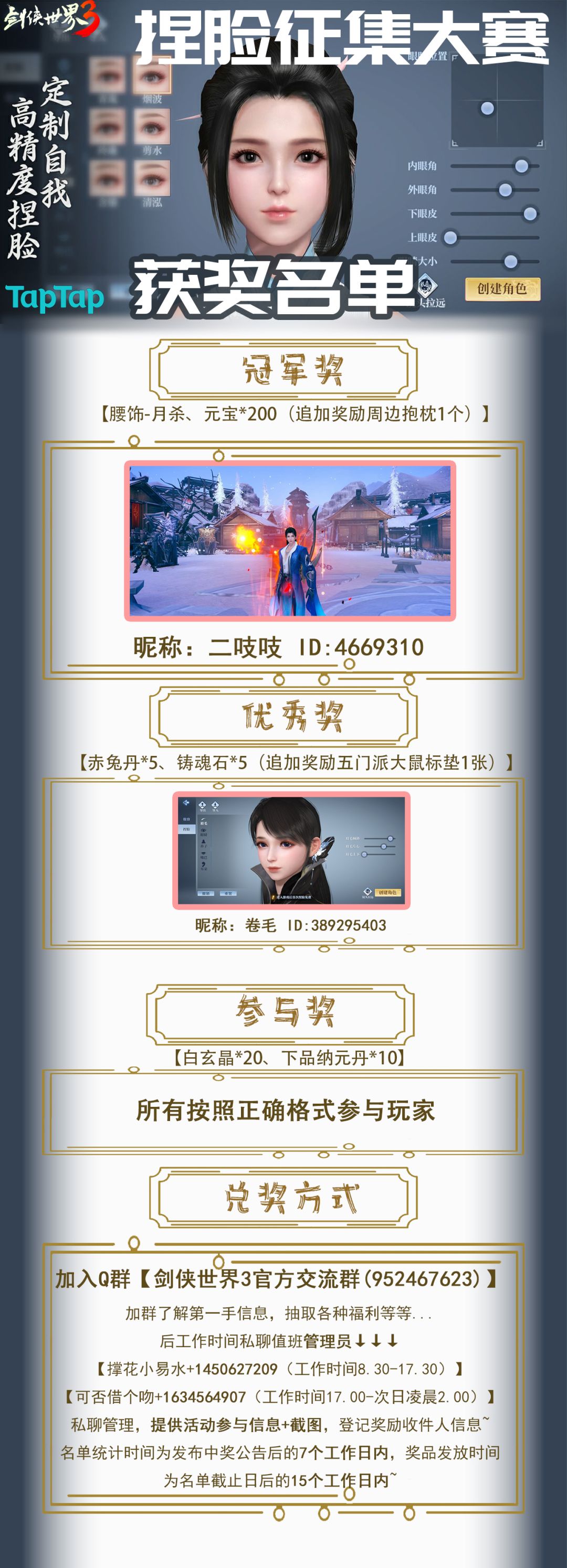 活动期间,侠士们在捏脸大赛主题贴下按照参赛格式留言评论,附上自己的原贴链接+原创捏脸截图,即视为参与本次活动。
