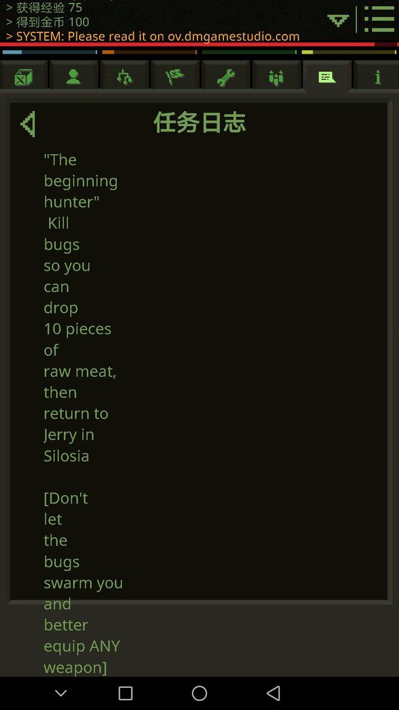进到城里,点击公告牌旁的NPC和他对话。他会给你一瓶水和一个烤串,继续和他对话他会给你还会给你两块布给你做一个绷带,一杯催吐剂和催吐剂的材料,去旁边的火炬制作催吐剂,把两份催吐剂给他完成任务。他会给你一个木棍。
