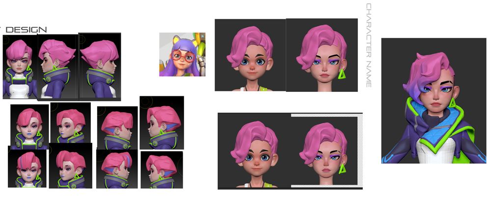 后面继续迭代机械、服装和发型的细节,讲一下为什么从直发变成卷发,实际上我们找了真实的头发参考,以及3D里可以呈现的效果,再讨论了她来自哪里(其实希尔是来自韩国,于是最终立绘的脸部轮廓和整体配色十分K-POP哦)。