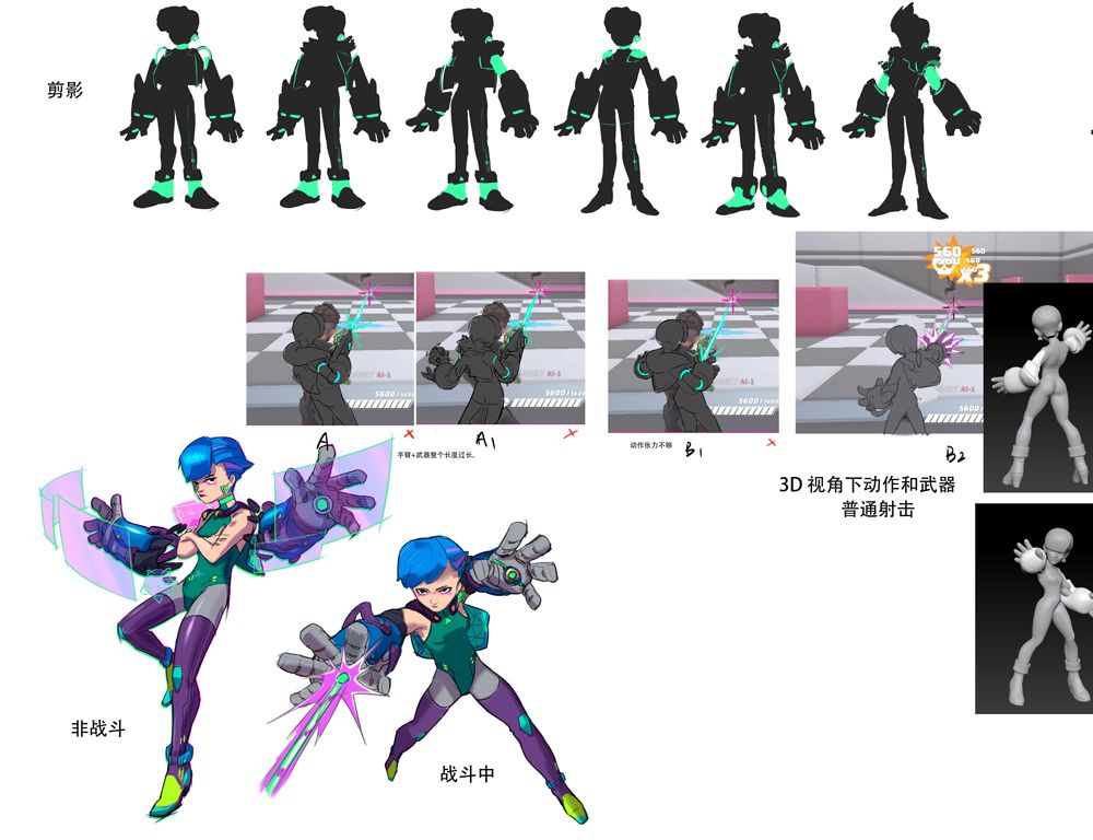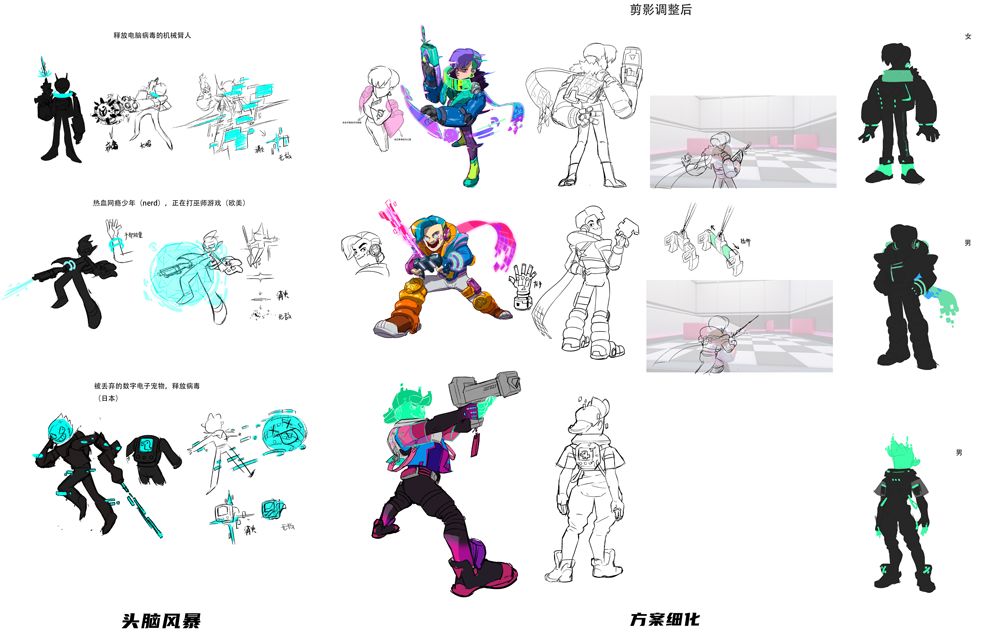 在第二版,也就是现在希尔的美术概念开启前我们各个策划小组经历了几番讨论,决定将希尔的武器设定为“能量穿透”型,因此希望能有一个明确的能量载体来表达角色的射击逻辑,这个逻辑表现应该是一条细线。于是美术小姐姐想到激光,激光是非常具有穿透力的细线,再就联想到数字数码,开始诞生了骇客、玩游戏的少年和虚拟电子宠物三个方案。方案初设时画的草图大家觉得都有点意思,便同时深入探索三个方案的可行性。