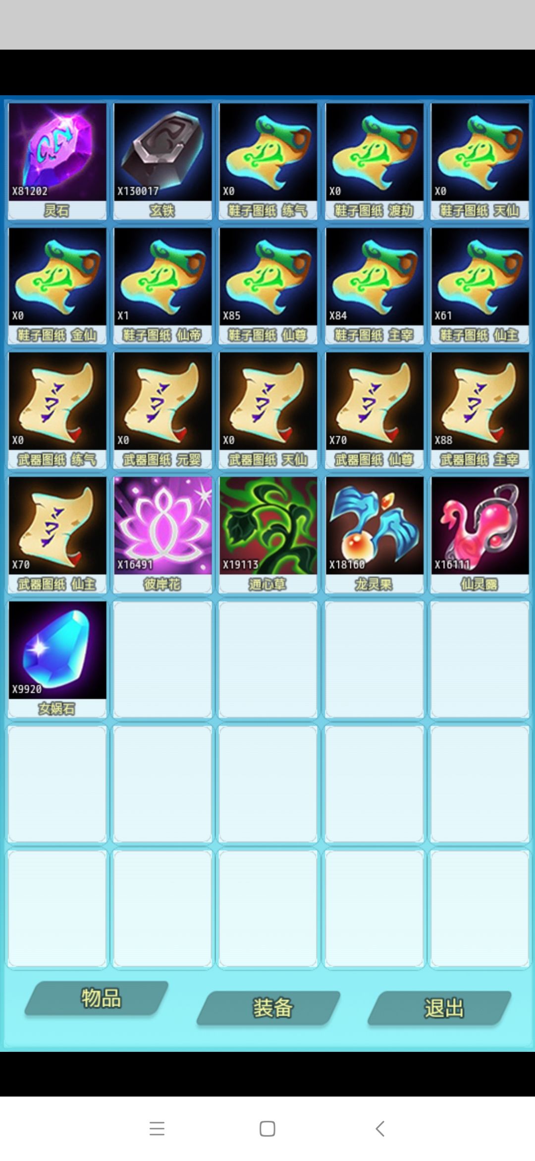 70件仙剑图用完了。仙鞋图用了30件。还有7万2千7百铁也就是说成功44件仙主装