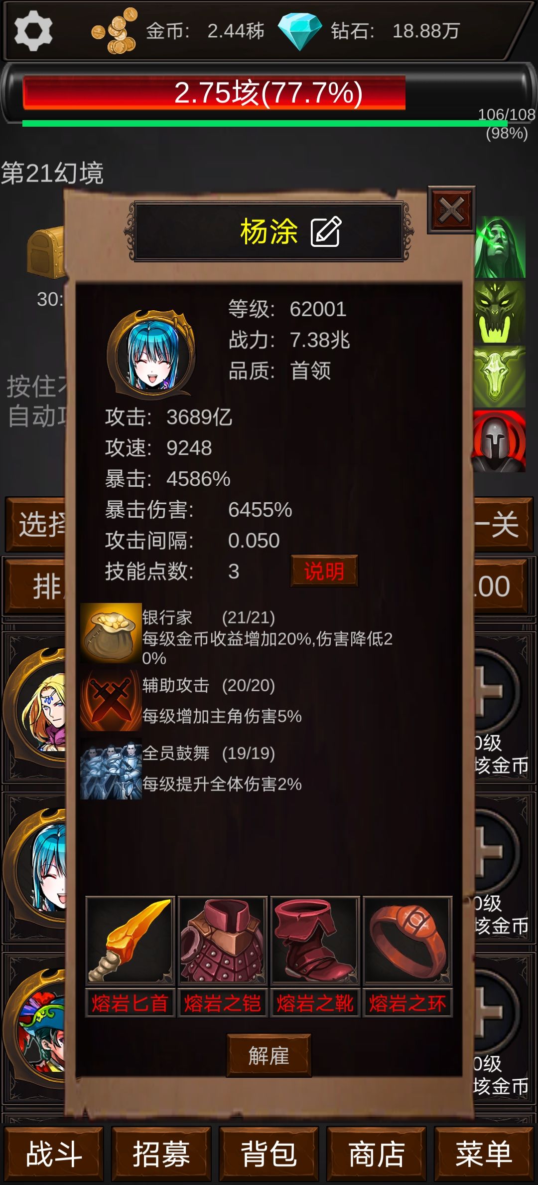 新增专家(绿),精英(蓝),首领(金)佣兵。按照作者的想法,其实是设置的5层以上出绿,10层以上出蓝,15层以上出金的,但是现版本由于某种BUG,5层以上就可以刷出这三种佣兵了。