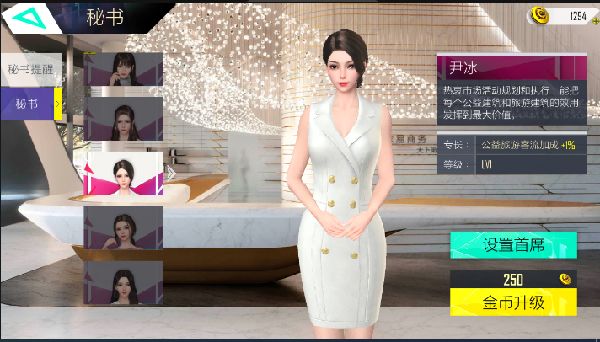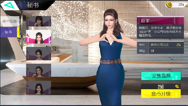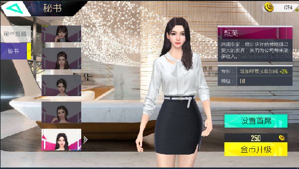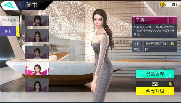 想要秘书帮公司赚更多的钱,节省更多的开支,那么需要对秘书进行提升培养,第一次升级需要花费250金币,所谓一分钱,一分货,随着技能的提升,秘书升级的费用也会逐步提高的。