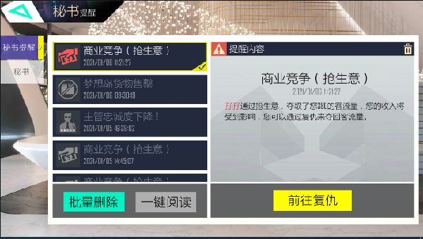 首先进入游戏界面左下角的秘书进行查看,看到的是秘书小姐姐平时对于一些店铺货物售完、主管不肯干活以及被行业竞争的提醒,方便第一时间及时应对。