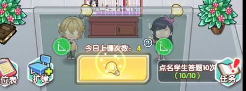 教室上课需要玩家自己去点击上课铃,每点击一次上课铃都会消耗一次上课次数。学生在上课过程中累计到一定的答题次数后,可以领取讲台上的每日答题任务,这个任务奖励会提供许多经费和心得。