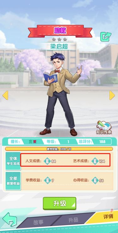 这块游戏最主要的卡牌,就是老师和学生了。学生和老师都可以进行升级或升品。学生升级会消耗心得,不过会增加学科属性和总成绩,升品后会获得一项额外属性,不同的学科获得的属性各不相同。