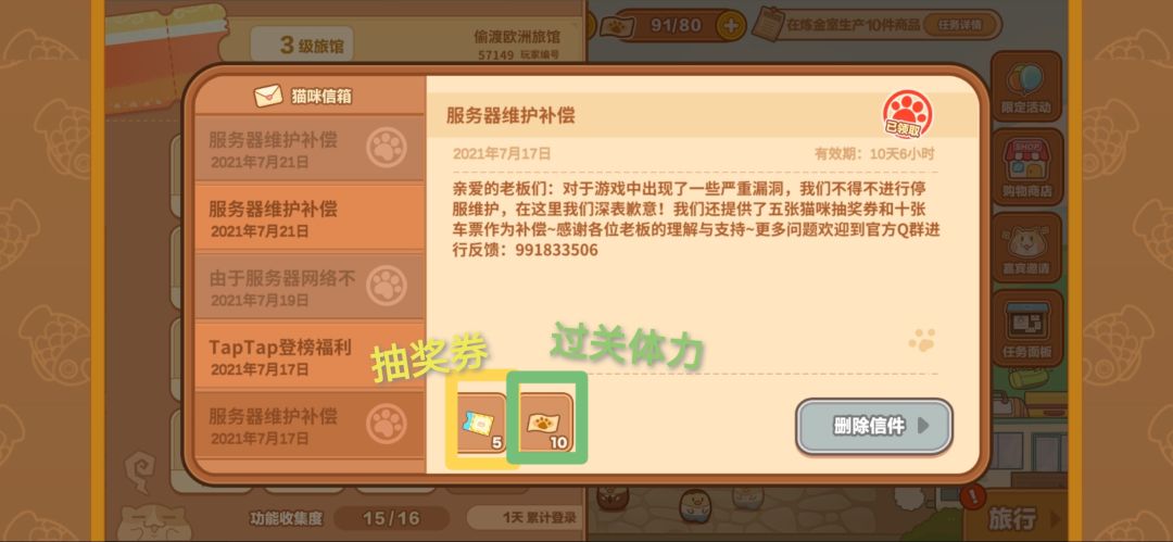 这时候就可以去邮箱领取重头戏了!白嫖30张抽奖券🎊可以先只领取带有抽奖券的邮件哦,体力比较多就可以不急着领。