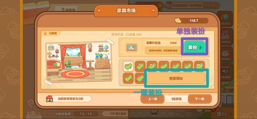 这时候回到界面点开左侧黄色小箭头,找到家具市场,选择整套购买后集齐家具,就可以升级旅馆啦。旅馆的布置可以更换。