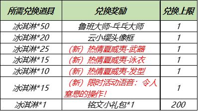 夏日福利乐享一夏!活动期间收集冰淇淋兑鲁班大师-乓乓大师(永久)、小乔-缤纷独角兽-热情夏威夷星元部件、云小缨头像框和全新限时活动语音:令人窒息的操作!等奖励!活动期间还将上架蔷薇之心和亲密道具等奖励,敬请期待!本期活动可通过“冰爽一夏”、“周末挑战”、等活动收集,还可通过特惠商城购买获得,最多可购买冰淇淋*10