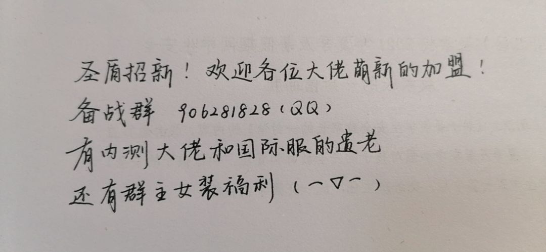 圣盾招新,欢迎各位大佬萌新的加盟,备战群906281828(QQ),有内测大佬和国际服的遗老。还有群主女装福利(⌒▽⌒)。