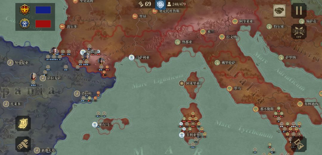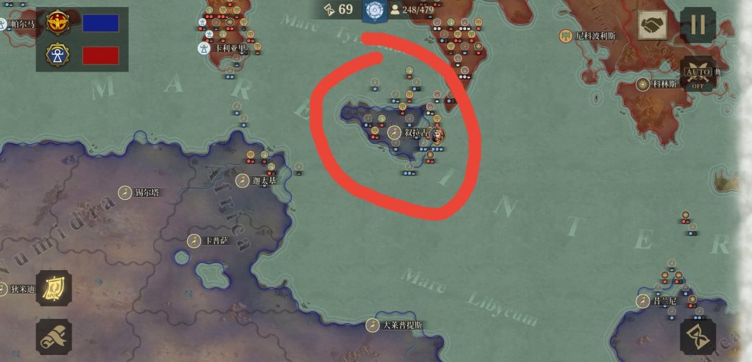 征服一,选的昔兰尼,前期没外交(之前搞外交啥用没有,罗马被锤子哥吊打,西线那还有个大爹,所以我求人不如求己),由于为了憋战车浪费好多回合,队友死的快,这是我大罗马灭亡后,我撤军前的图(人太多了呀,罗马几千的经济,没城补兵,被围殴致死,老家还被希腊投援军晚了点)