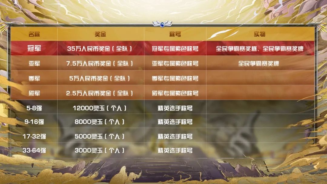 赛事奖励:
