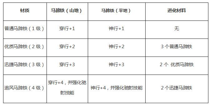 最近更新的马蹄铁,合成到满级可以+4移动力,相信官方也是很无奈的,马匹,本来的初衷应该就是加移动力的吧,谁能想到玩家都选了驰射,飞燕之类的,合成满级马蹄铁要7200金刀,虽然是贵了点,但是如果能搭配合适的技能可以直接起飞,尤其是偃月阵这种腿短的阵型,装上之后已经赶上普通的平地阵了,好了马蹄铁就不多说了,官方的帖子也挺详细的,只要注意不要装错地形就好,想了解的去看官方链接