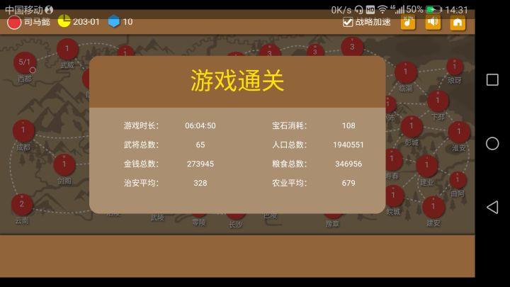 玩的是标易寿小图,一天一个晚上搞定。由于寿命原因后来把君主换成司马懿。刘备前期真的难打,所以一定先要找一个同盟。我的思路是先把袁绍干掉得到赵云,在一路南下,拿下孙坚。在往中间走。本以为我要和曹操干一架,没想到后来曹操死了。没办法,有寿命限制,到201和202年时我的大将都会死,所以打下刘璋后直接干马腾,最后获胜。这是我第三次玩这个游戏,前两次用的是曹操,曹操挺适合新手的,因为前期可以反间得到吕布。这游戏还是挺好玩的,我要去挑战大图了。