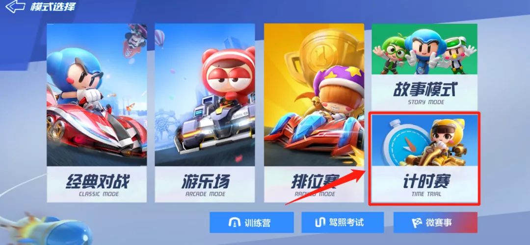 那么在哪里才能进行“跑图”练习呢?在选择比赛模式界面选择计时赛模式,选择想要练习的赛道后就能开始练习了~