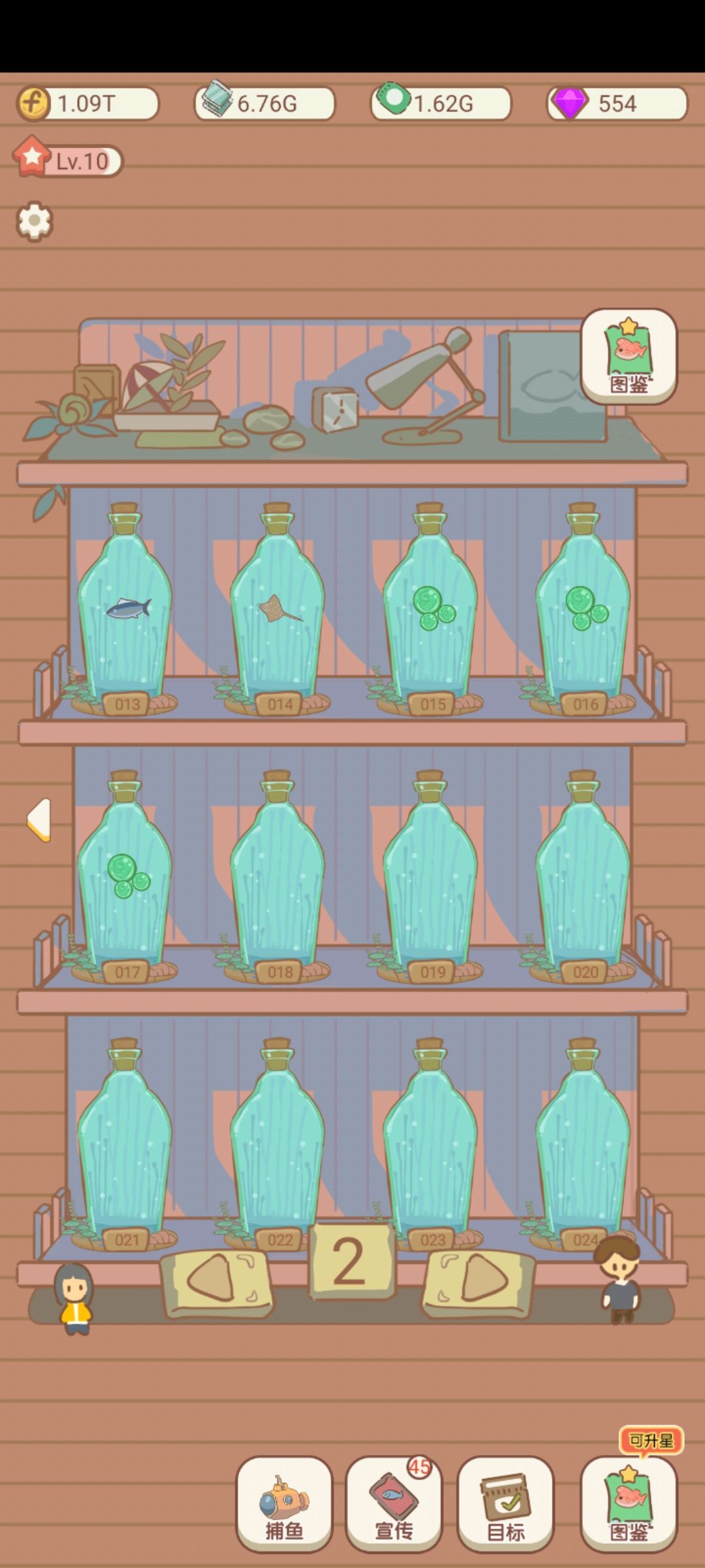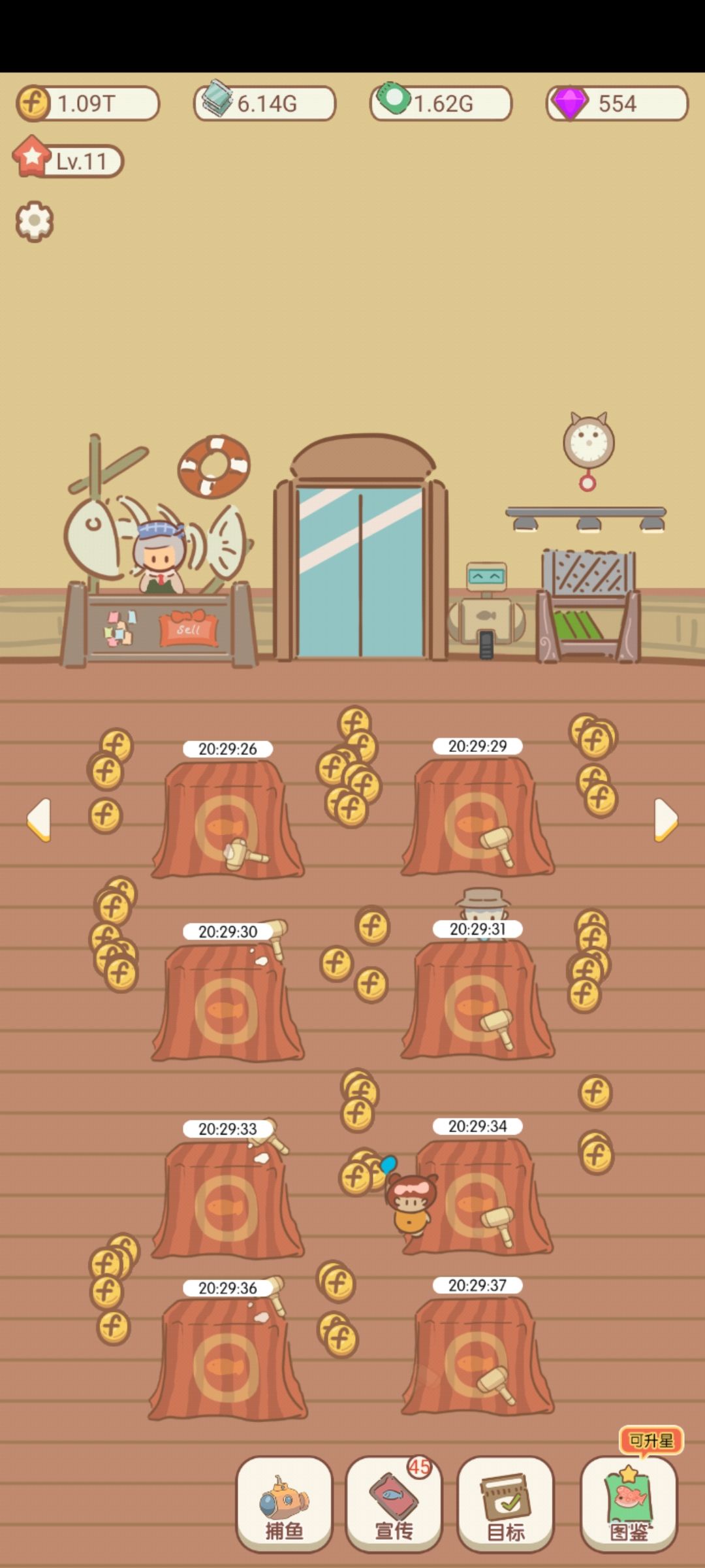 鱼缸差不多5-6级就行,太浪费时间了,有机器人鱼缸不会空的,而且升一级就+1%的收入没啥用。