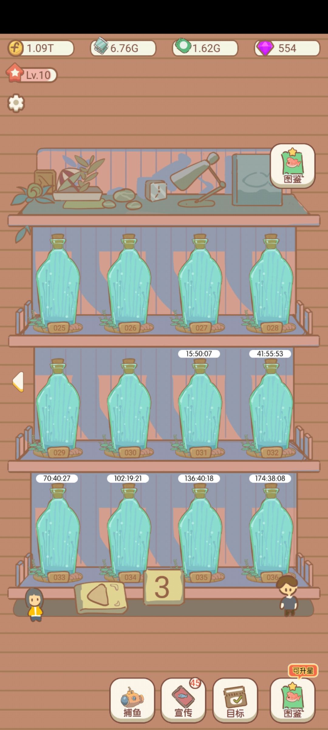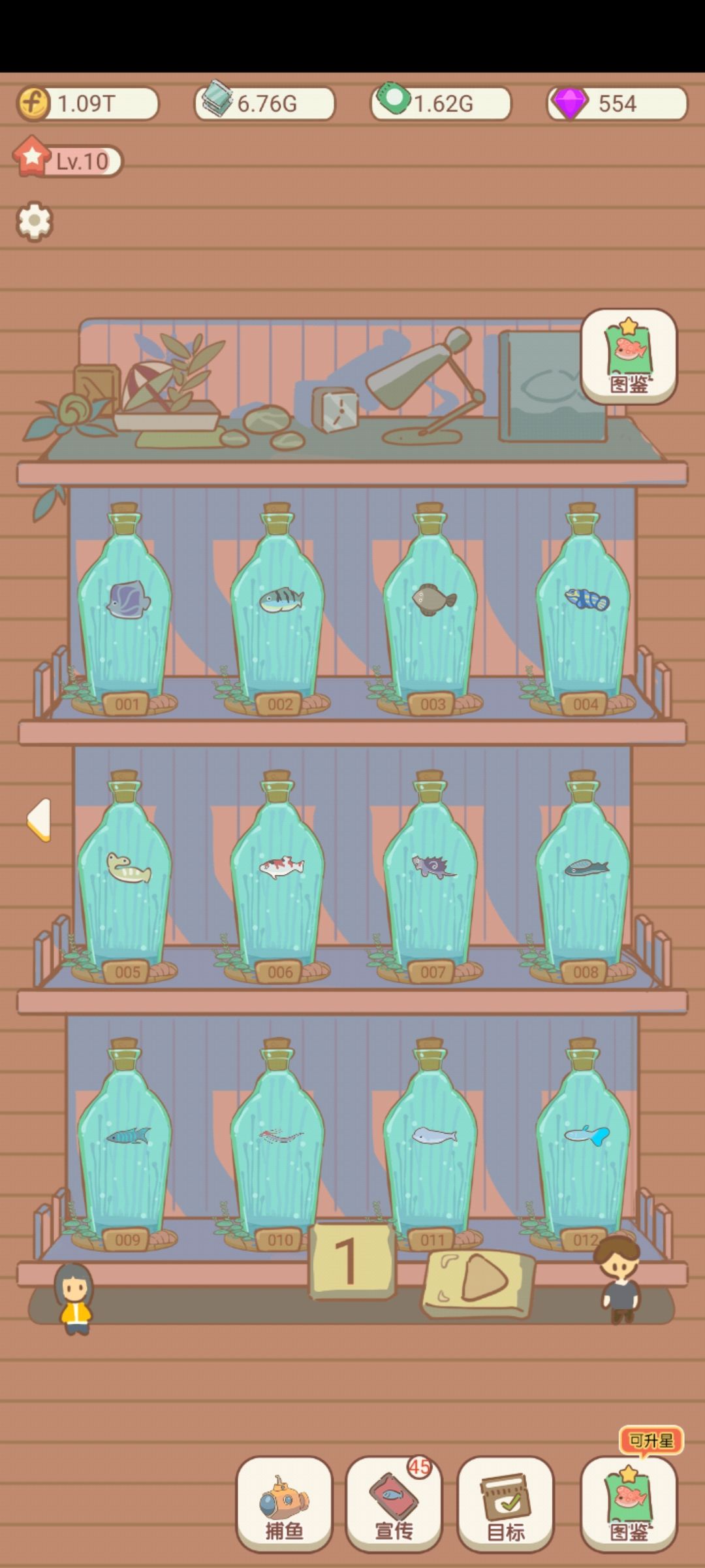 也玩了好几天了,差不多能升的都升了(因为稀有鱼没法卖所以潜艇最高49级),就差鱼缸,要的时间太长了,也就没升级。