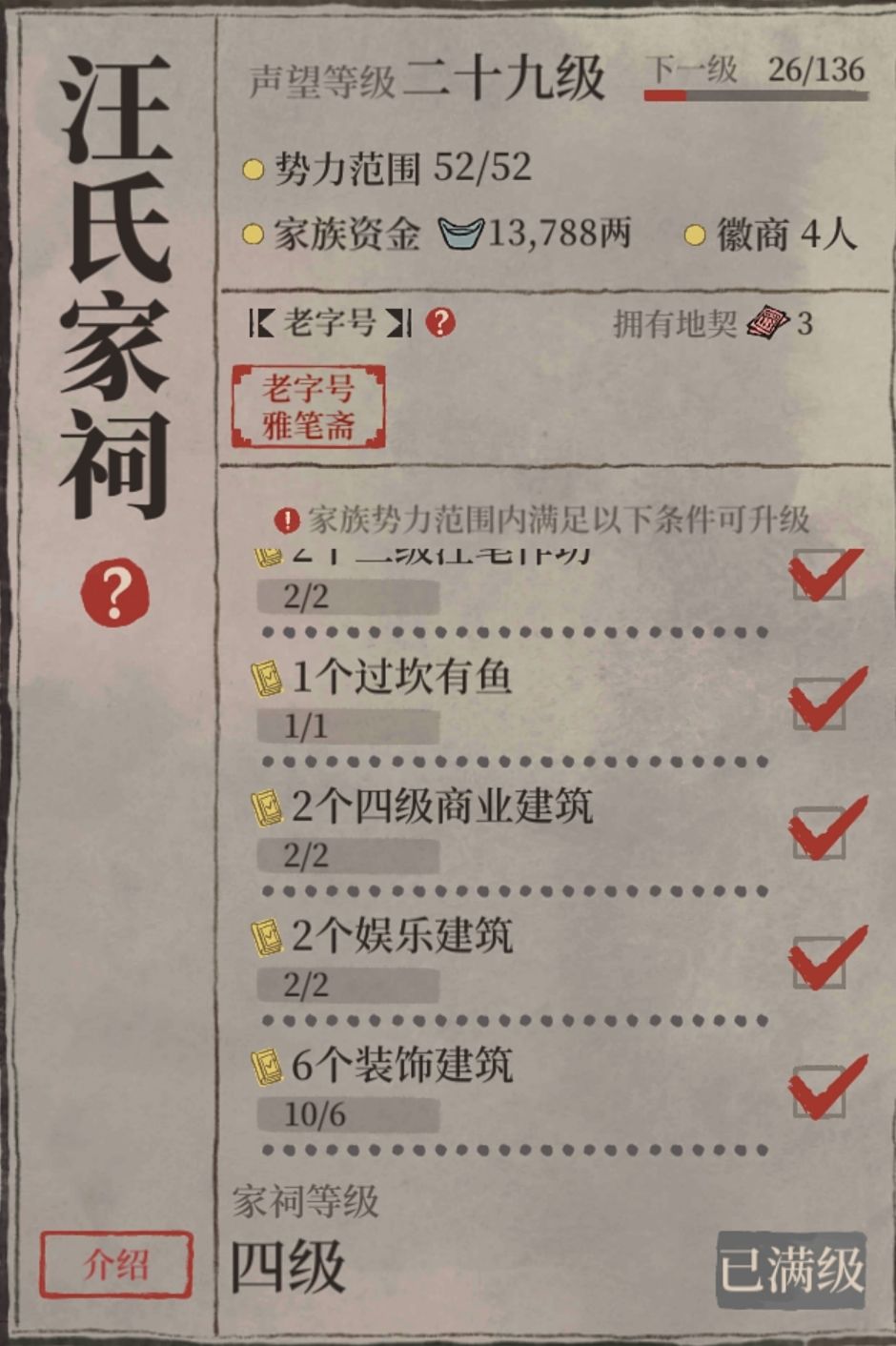 提升家祠等级需要势力范围内有规定的建筑,势力范围提升,需要声望等级提升,每升一个势力范围需要一些家族资金,家族资金从经商中获取