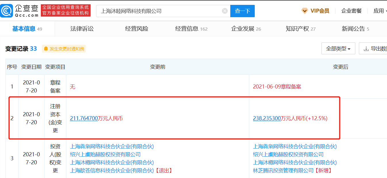 企查查官网显示,近日,上海沐睦网络科技有限公司发生工商变更,新增股东林芝腾讯投资管理有限公司,同时公司注册资本由211.76万元人民币增加至238.24万元人民币,增幅为12.5%。