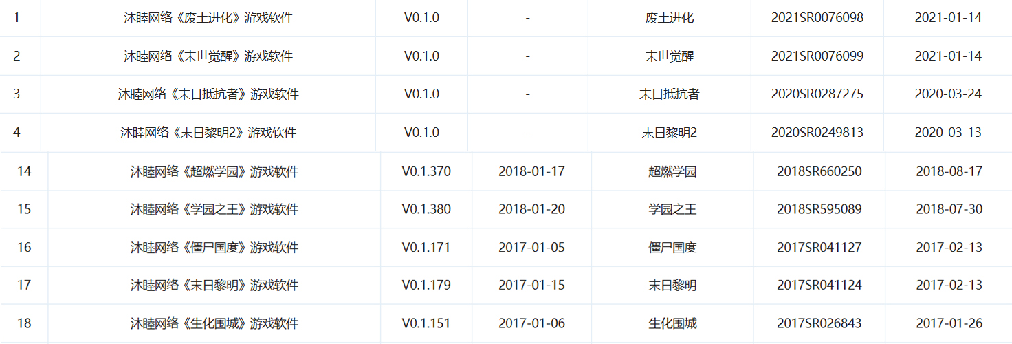 企查查官网信息显示,沐睦网络同时还拥有《废土进化》、《末世觉醒》、《末日黎明》等多个末日题材SLG游戏的软件著作权。