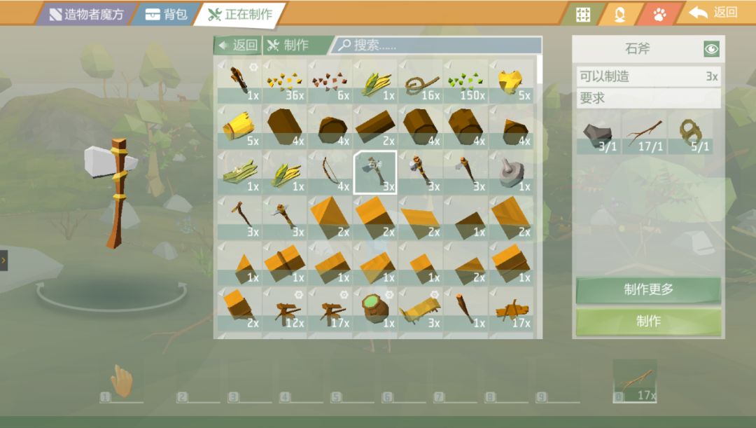 然后,按下“O键”打开“制作面板”通过使用草x3,点击右下角的“制作”,制成“草绳”道具,然后通过草绳+石头+木棍,在“制作面板”中去制作一把石斧、石锤、石镐等工具。