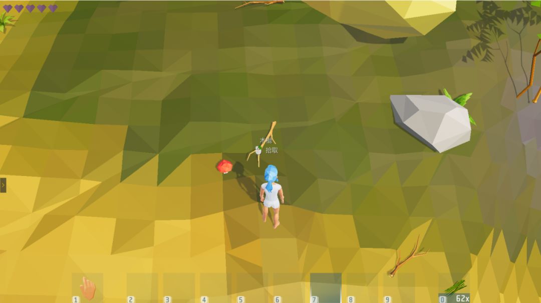 随后,我们应该趁着天亮,通过靠近地面上散落着的“草”、“木棍”、“石头”、“燧石”,然后按“右键进行拾取”,尽量多拾取一些,后面会用到。