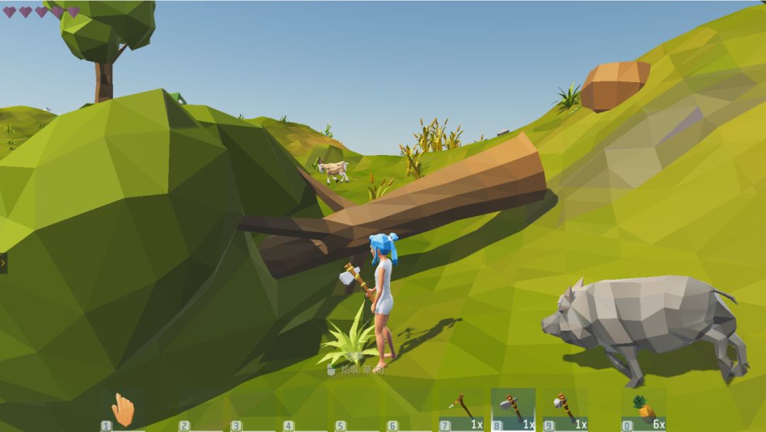 在制作完一系列的石器工具之后,我们可以使用“石斧”,靠近树木后点击“鼠标左键”挥动斧头进行伐木。然后收集原木、树脂、木棍、木片等一切原材料。