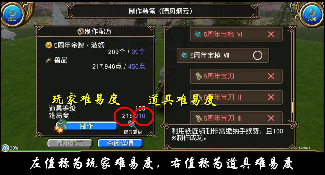 我们不妨将锻造界面中此处的左值称为玩家难易度,右值称为道具难易度。
