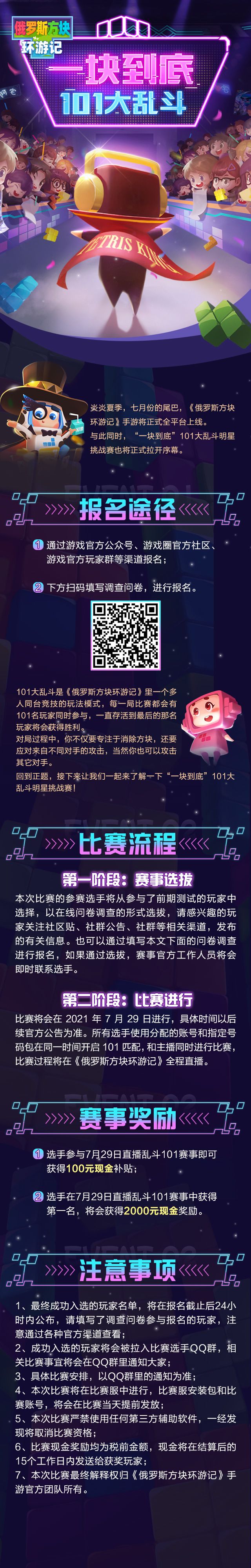 炎炎夏季,《俄罗斯方块环游记》手游将于7月29正式全平台上线!与此同时,“一块到底”101大乱斗明星挑战赛也正式开启报名!想要体验百人对决,赢取最后现金大奖?我们在这里等你来参与!详细招募规则请戳下图哦~