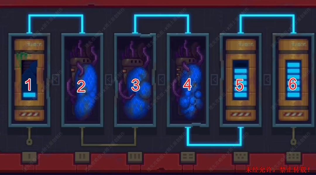 12. 接着将老鼠的电囊放到机器当中,在这里将要进行一个小游戏调整电囊的位置,让机器可以启动,如图将整个电囊的槽位从左到右分为1到6,在这里进行电囊调换从二号槽位和三号槽位进行调换,三号槽位和四号槽位进行调换,这样整个机器就可以启动了。12.1