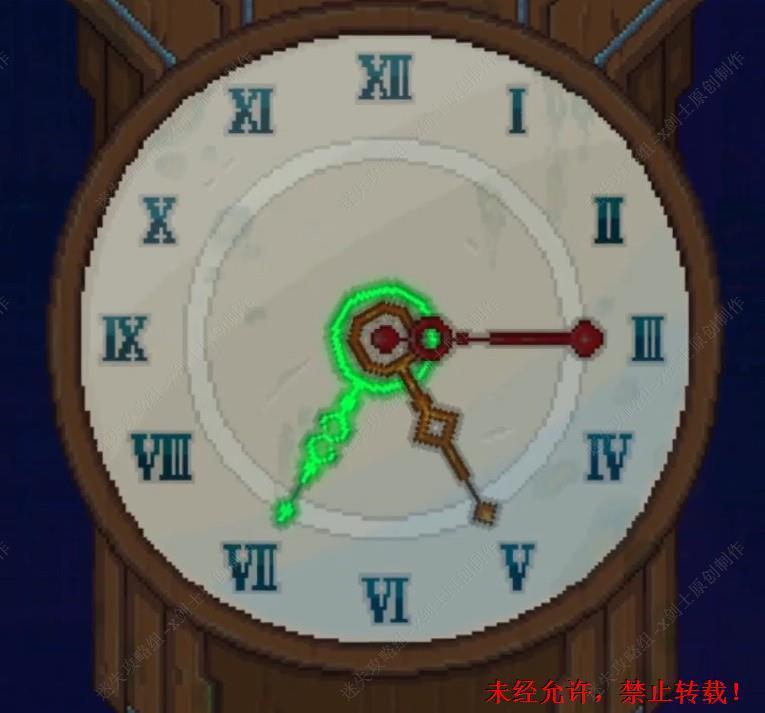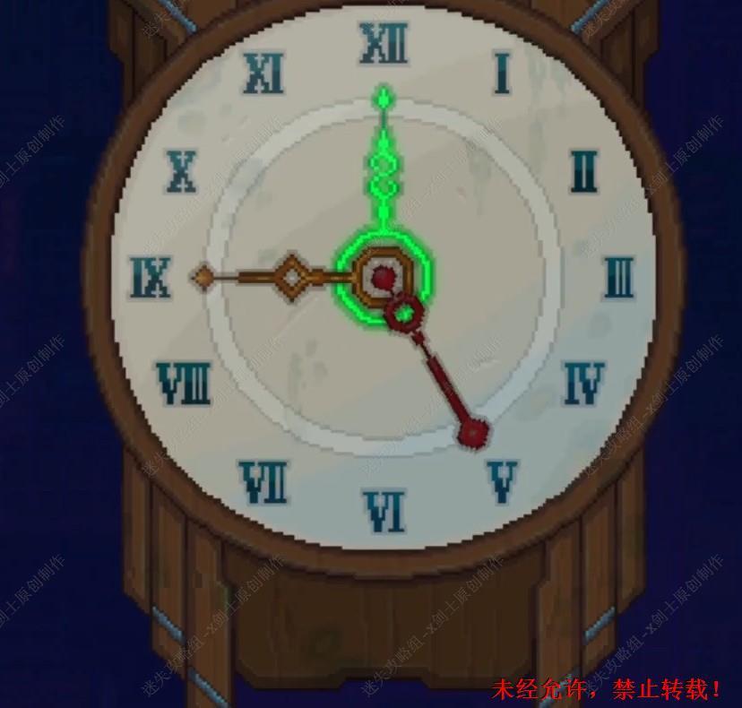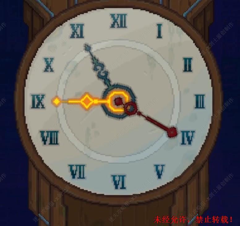 94. 来到时钟的位置,启动时钟,在这里如图进行调节时钟,时钟想起之后就可以在旁边的柜子上面可以得到一瓶酒。94.1