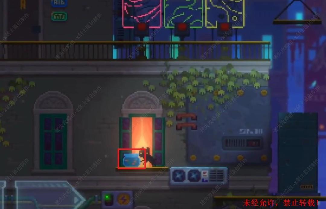 81. 来到这里和生化猫就可以进行交谈,来到房屋最上方的位置,在这里弄断电线,这样广告牌就会倾倒。81.1