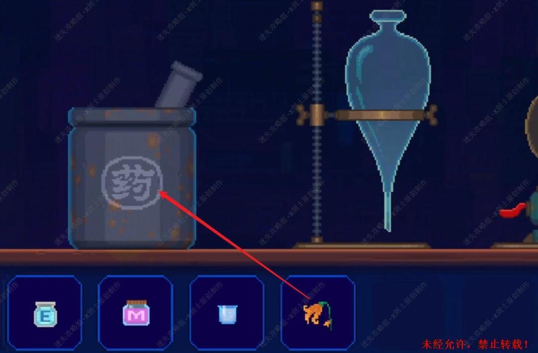 108. 来到中间的工作台位置,在这里调节醒酒药,首先先将忘忧草放到最左边上面的捣药罐当中,进行捣药。108.1