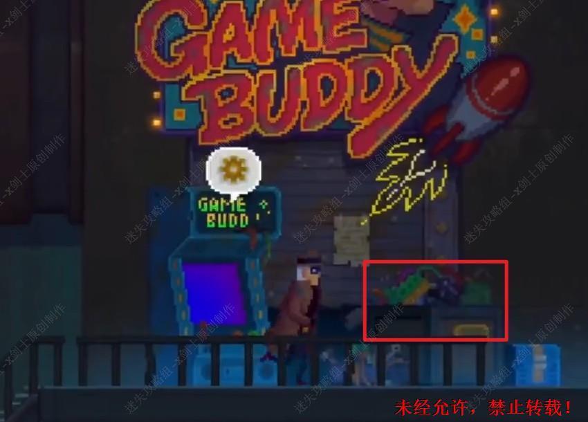 142. 之后往左走在垃圾箱的位置在中间的垃圾箱可以找到学习芯片,来到左边在这里和路人进行交谈可以得到关键信息。142.1