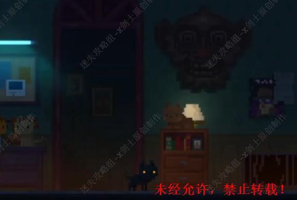 104. 来到客厅的位置就会发现在这里有一堆猫在蹦迪,在在客厅来到最左边的位置,在这里可以找到一份资料,在厨房当中可以看到忘忧草在蓝猫上面。104