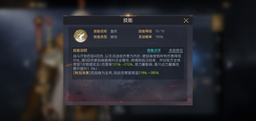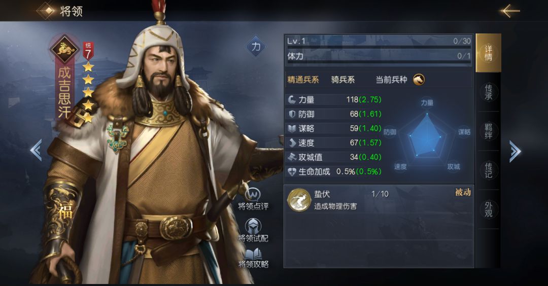 成吉思汗是目前后手队伍的代表人物之一,他自带技能蛰伏会使自己在前4回合无法造成伤害,但同时也会大量降低自身受到的伤害,正如其名,4回合之后成吉思汗会获得极高的全属性加成,并造成一次AOE,基础伤害率就能达到380%,配合白起、秦始皇等将领使用时效果奇佳。